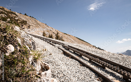 mountain, countryside, heaven, nature, rock, hill, travel, piter, blue, summer, peak, slope, view, scenic, train, rail, transport, transport, wilderness, steel, outdoors, force, building, gravel, railway, metallic, rock, trainer, mount, objective, way, iron