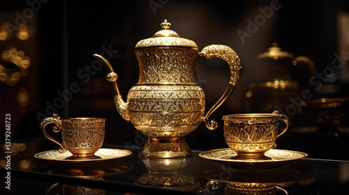 Elaborately decorated golden teapot set with ornate cups and saucers, luxury style