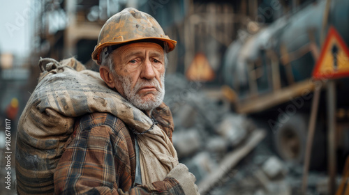 Elder worker carrying heavy bag sack load at his back because of old age poverty blurred background