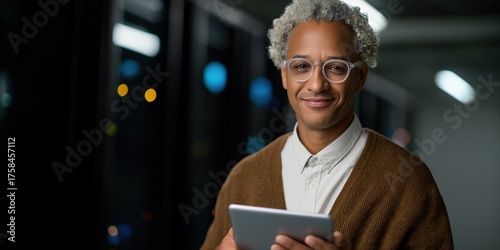 elderly, african, male, tablet, office, modern, night, smiling, goggles, curly, hair, technology, digital, device, business, sweater, shirt, corporate, lighting, workspace, sharpened, concentration, professional, mature, sophisticated, grey, beard, intelligent, holding, reading, urban, window, indoor, confident, work, business building, casual attire, glance, evening, senior, employee, engaged, glow, high technology