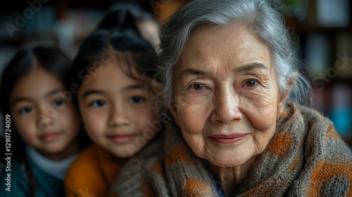 asian woman, grandmother, family, portrait, closeup, indoor, warm, loving, connection, family portrait, togetherness, bond, affection, grey hair, smiling, happy, children, girl, diversity, cultural, heritage, generation gap, bequest, care, support, love, kindness, empathy, emotion, feeling, intimacy, candid, real people