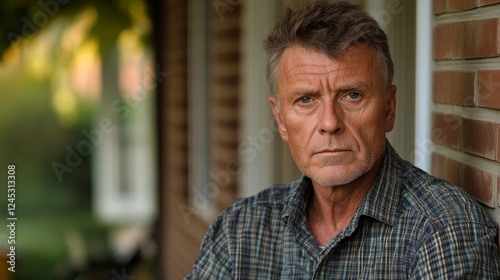 Elderly caucasian male with gray hair in plaid shirt against brick wall background