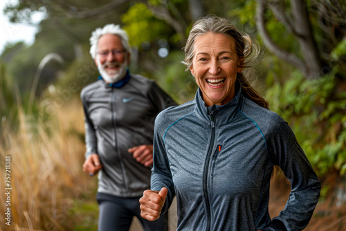 Elderly Couple Embracing Active Lifestyle: Senior Man and Woman Joyfully Jogging Outdoors Together in Nature for Health and Happiness