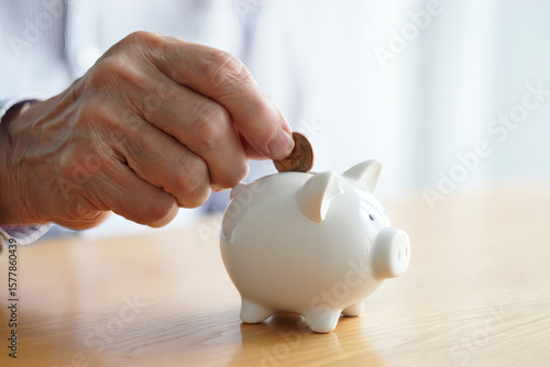 money box, saving money, coin, personal finance, budget, white background, wooden table, photorealistic