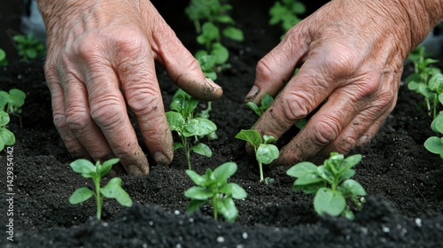 Elderly hands gently planting seedlings in rich dark soil, nurturing new life.