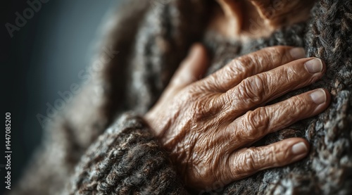Elderly hands rest on a chest, wrapped in a cozy, warm sweater, conveying warmth, age, wisdom, and comfort.