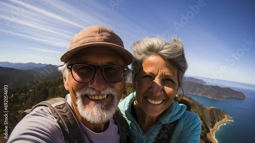 selfie, mountain landscape, scenic view, joyful, happiness, journey, adventurous, mature, retirement, exploration, leisure, bond, love, travel destination, vacation, serenity, relaxation, picturesque, tranquil
