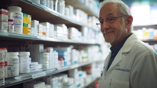 apothecary, elderly, male, caucasian, pharmacy, medicine, shelf, drug, prescription, health, health care, professional, goggles, labcoat, medication, bottle, aisle, pharmaceutical, store, senior, mature, expertise, cognition, retail, client, service, shop, care, occupation, industry, pill, label, cardboard box, organised, medicals, workplace, smiling, friendly, experienced, knowledgeable