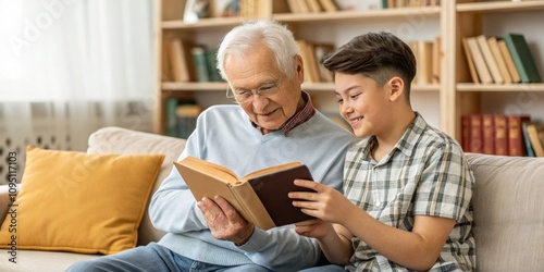 grandfather, grandson, reading, book, family, bonding, togetherness, love, care, home, living, room, sofa, cosy, happy, education, learning, childhood, parenting, grandparent, generation, storytelling, leisure, quality, time, connection, human relationships, support, retirement, wisdom, tradition, cognition, literature, smile
