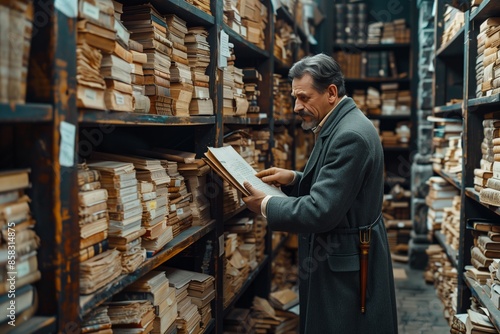 Elderly Man Browsing Books in a Dusty Antique Bookstore
