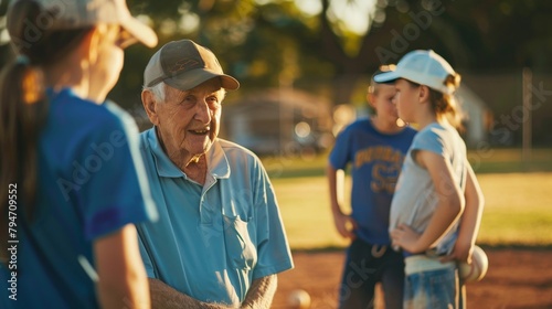Elderly man coaching a children's baseball team at a community field