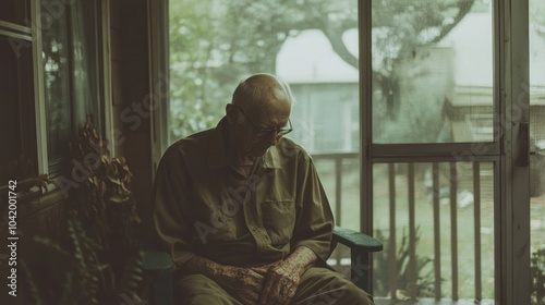 Elderly Man in Prayer. Elderly man sitting in a chair by the window at home.