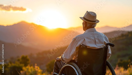 man, wheelchair, sunset, hill, elderly, value, oneness, memory, wisdom, justice, serene, retirement, diversity, hope, opportunity, contemplation, mobility, harmony, disability, peace, cognition, spirituality, strength, wellness, learning, support, assistance, exploration, senior, achievement, dream, future, inspiration, vista, feeling, success, aspiration, equality, independence, motivation, peaceful, balance, respect, awareness, gratitude, compassion, kindness, hours, understanding