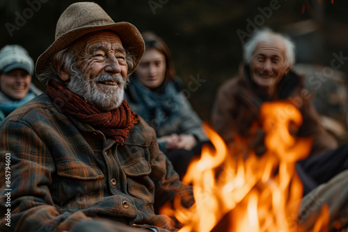 elderly, man, laughing, campfire, friends, outdoors, mature, senior, male, hispanic, beard, hat, plaid, jacket, foulard, autumn, evening, warmth, companionship, adventure, nature, activity, social, gathering, happiness, joy, bonding, storytelling, fire, cosy, relaxed, rustic, camaraderie, wilderness, camping, life events, togetherness, twilight, peaceful, leisure, travel, cold, wood, evening light, old, people, face