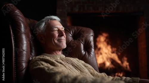 elderly, man, sitting, brown, leather, armchair, fireplace, wearing, beige, sweater, warm, smile, face, relaxed, comfortable, eye, resting, armrest, chair, lit, orange, flames, cosy, atmosphere, background, dark, focal, relaxation, photo