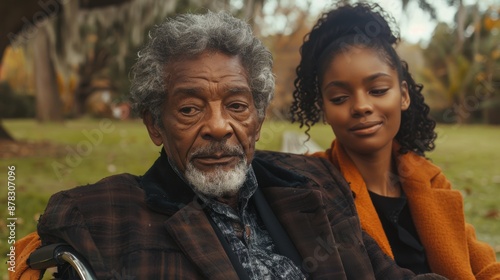 elderly, man, caregiver, park, companionship, bonding, care, senior, young, woman, nature, support, family, peaceful, human relationships, friendship, grandfather, granddaughter, autumn, assistance, loving, emotional, wheelchair, relaxation, setting, well-being, ageing, citizen, caretaker, leisure, community, nurturing, togetherness