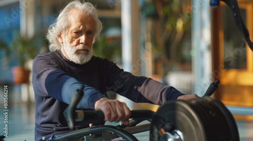 Elderly man using a rowing machine, focused on his fitness goals in the gym