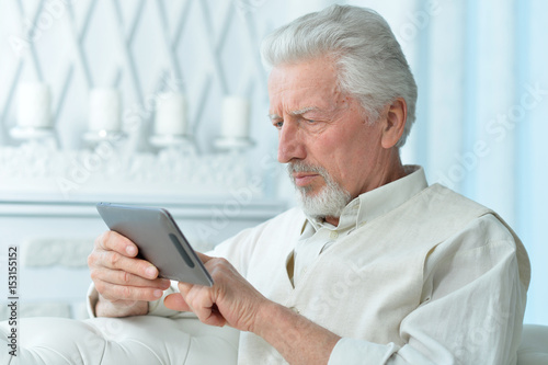 adult, aged, casual attire, caucasian, computer, digital, elderly, grey-haired, hair, photogenic, happy, holding, home, indoor, cyberspace, leisure, lifestyle, looking, male, man, mature, modern, old, person, portrait, retirement, senior, sitting, smiling, tablet, technology, using, white, wireless