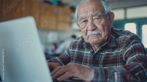 Elderly Man Using Laptop in Tech Class to Stay Connected with Social Media and Family
