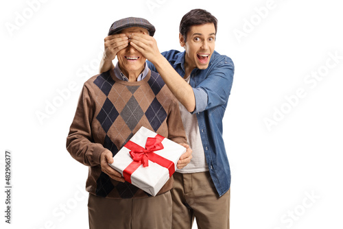 2, adult, background, birthday, blindfold, box, care, caring, casual attire, caucasian, celebration, covering, elderly, expression, eye, family, generation, gift, grandfather, grandson, guy, holding, isolated, kind, looking, love, male, man, mature, nephew, old, pensioner, people, person, present, retired, senior, shot, studio, support, surprise, 2, white, young