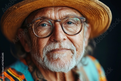 Elderly man with glasses and a straw hat showcases wise expression and colorful attire in close-up portrait