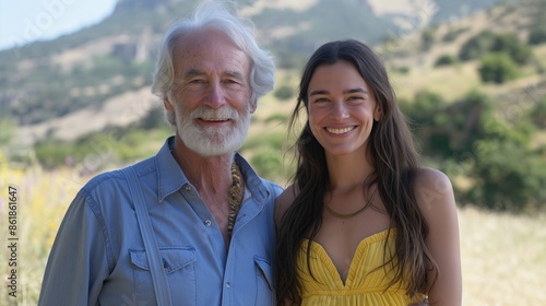 Elderly man with grey hair and smiling woman with long brown hair standing in a field, she is in a yellow dress, he is in a blue shirt, morning light, minimalistic background, waist-up photo