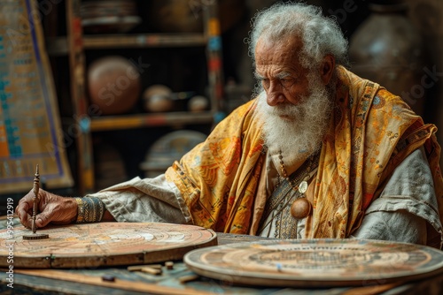 elderly, man, working, circular, design, old, white, beard, long, hair, pattern, wood, table, hand, finger, tool, focused, concentrated, artisan, craftsman, art, artist, creation, detail, intricate, meticulous, skilled, traditional, cultural, heritage, history, workshop, studio, vintage, antique, closeup, portrait, colours, gold, brown, orange, grey, light, shadow, sharpened, blur, background
