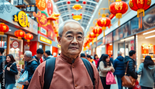 Elderly mature man in stylish clothes with festive mood among decorated modern shopping mall in honor of Chinese New Year. Preparing and buying gifts for the holiday.