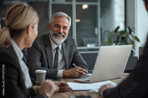 Elderly old man sits with young consultant at home, discussing pension retirement plans, insurance, and financial planning. Documents and laptop on the table as details for future financial security.