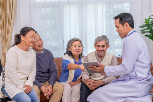 elderly people discussion in psychological counseling room with psychologist lead a group therapy working by using tablet computer
