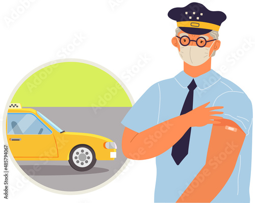 Elderly police officer wearing protective medical mask showing arm with bandage after receiving covid-19 vaccine. Concept of vaccination, health, immunization, healthcare, fight against coronavirus