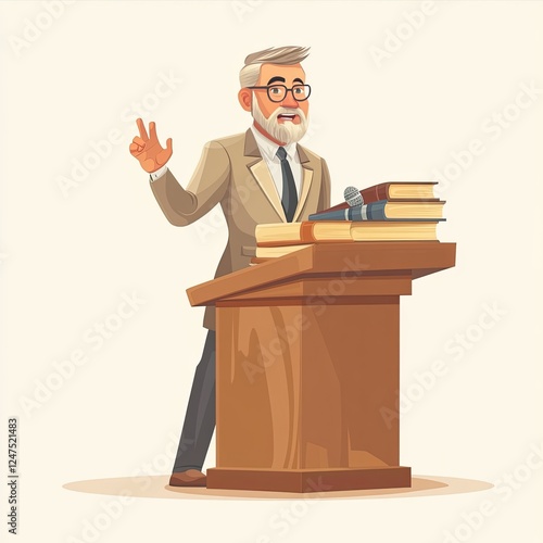 man, old, senior, prof, teacher, lecturer, speaker, presentation, speech, dais, lectern, microphone, book, cognition, wisdom, education, learning, teaching, lecture, conference, seminar, academic, intelligent, elderly, mature, experienced, expert, grey, hair, goggles, gesture, hand, talking, speaking, communication, public, audience, standing, wooden, desk, platform, illustration, cartoon, character, person, adult, male, concept