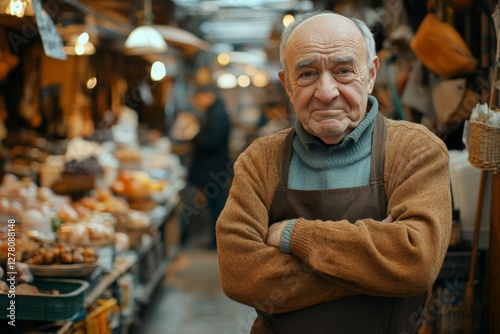 market, elderly, produce, hand-made, good, atmosphere, bustling, man, arms crossed, afternoon, smiling, colourful, fresh, local, commerce, tradition, community, trade, shop, snack, artisan, marketplace, interaction, client, grocery, people, rural, warm, inviting, smiling face, cultural, background, detail, life events, lifestyle, business, entrepreneurship, hand, expression, craft