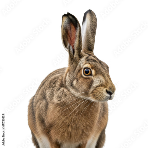 hare, wild, elderly, fur, amber, eye, alert, crouched, survival, animal, mammal, wildlife, brown, grey, coat, ear, keen, intelligent, scanning, watchful, stoic, resilience, strength, instinct, primal, wise, enduring, quiet, nature, white, background, studio, seamless, minimalist, bright, high key, photorealistic, portrait, closeup, detail, texture, sharp, sharpened, quality, professional