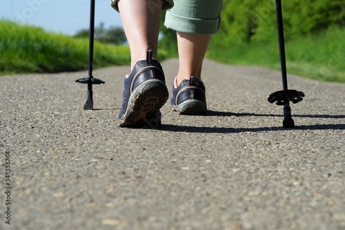 Elderly woman does Nordic Walking on an asphalted field road. Female legs with Nordic Walking poles on a cartway at a sunny day in spring.
