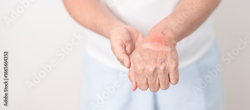 Elderly Woman having wrist pain with Medicated pain relief patch plaster for Carpal Tunnel Syndrome, Wrist Tendinitis, muscle ache, De Quervain s tenosynovitis, Hand Osteoarthritis and Senior health