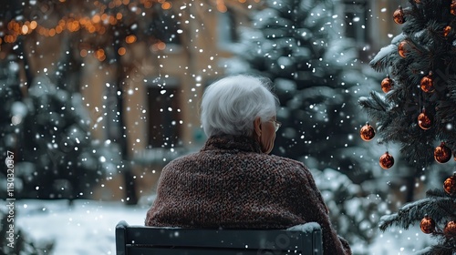 Elderly woman sitting on bench watching falling snow near christmas tree