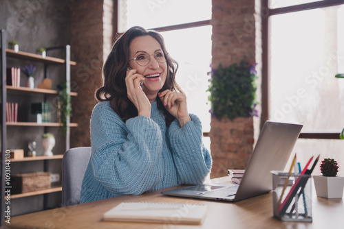 Elderly woman with brunette hair in blue sweater enjoying leisure time at home office, talking on phone