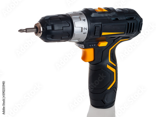 electric cordless screwdriver drill isolated on white background, professional home repair tool, hand power tool, copy space, mock up, design