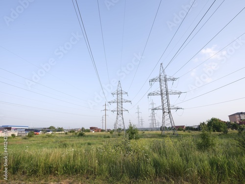 power, electricity, energy, line, electric, sky, tower, cable, pylon, voltage, industry, wire, high, blue, field, electrical, technology, steel, industrial, powerline, nature, transmission, landscape, metal, pole
