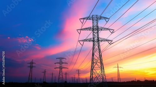 Electric power pylons against a vibrant sunset sky. The industrial concept of energy transmission. The image highlights the engineering and infrastructure of power distribution.
