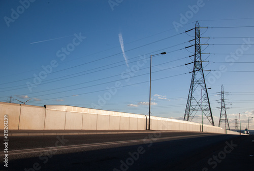 pylon, road, power, electricity, energy, sky, bridge, tower, line, cable, electric, highway, blue, electrical, high, voltage, travel, industry, landscape, asphalt, sunset, wire, industrial, water, transmission, steel, volt, field, vertical, structure, street, concrete, modern, lamp, post, architecture, sun, sunny, shadow, line, building, cloud