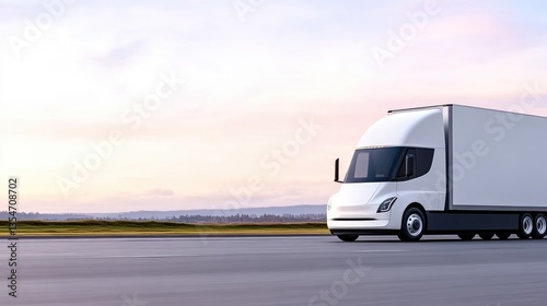 Electric semi-truck on a paved road at sunrise