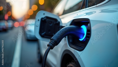 Electric vehicle charging at city street charging station. Modern car with plugged power cable. Eco-friendly transportation in urban environment. Charging process takes place in busy city setting.