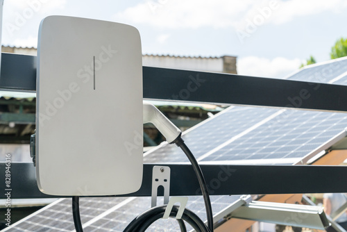 Electric vehicles charging station that takes energy from solar panels. Close up..