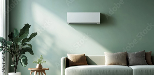 Electric water heater is fixed to the wall of a stylish living room featuring green walls, a comfortable couch, and decorative plants