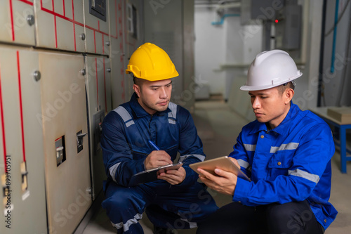 Electrical engineers and technicians work together to solve electrical system failures in industrial control rooms.supervisor maintains the circuit cabinet.