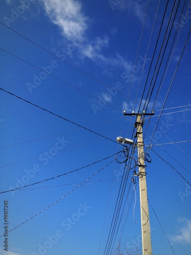 sky, powerline, pole, column, pile, wire, wired, tree, conductor, rib, outside, post