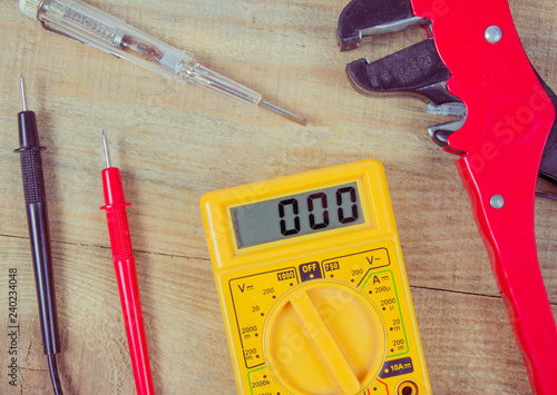 electrical, tool, electric, multimeter, voltage, electrician, power, equipment, electricity, background, work, cable, wire, construction, table, repair, instrument, installation, plier, wooden, home, tape, screwdriver, engineering, tester, energy, electronic, set, industry