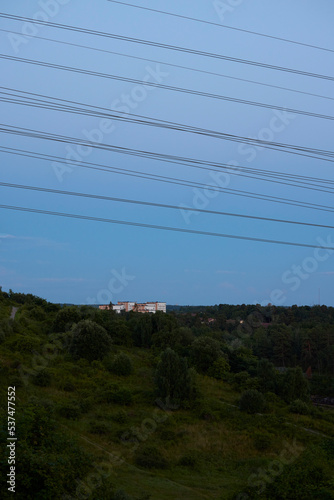 energy, powerline, power plant, fossil fuel, landscape, scenery, electric, electrical, electricity, cable, blue, blue color, connection, connexion, environment, environmental, tree, no one, no people, no one, nobody, vertical, outdoors, outside, day, daylight, daylight, daytime, from below, low angle, blue skies, sky, clear sky, horizon, building, built structure, edifice, real estate, heaven, colours